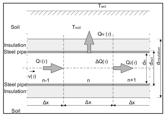 A similar model was used to simulate the dynamics of heat transport in a substitute pipeline (Figure 5). It assumes the discretization of the replacement pipe into split elements of equal length —element method [29]. The number of N-pipe splits depends on the adopted time step (1 h) and the value of water velocity in pipe. The number of pipe splits into balance elements is determined by the relationship in Equation (16).