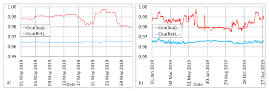 Changes in Courant number values in the supply Cou(Sup) and return Cou(Ret) pipeline during the calculation for data in May 2019 (a), and the whole year of 2019 (b).