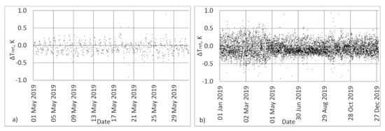 Figure 8 presents the results of the numerical model verification performed for the measurement data recorded in 2019 (Figure 8b) and in May 2019 (Figure 8a). The value of the return water temperature difference, , varies from −0.3 K to +0.3 K. The resulting accuracy of the calculation is sufficient for simulation calculations.