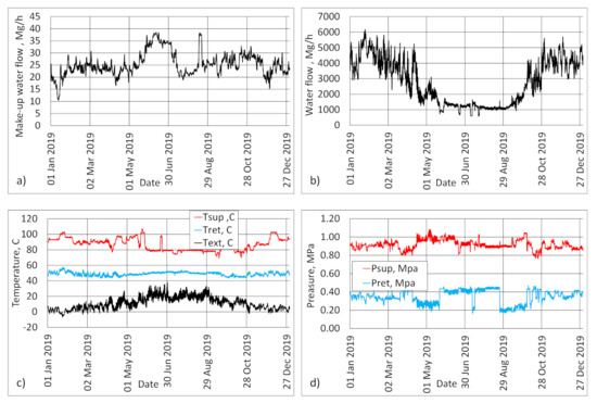 Measurements of DHS operation parameters in 2019: (a) water make-up; (b) water flow; (c) supply and return water temperature and outside air temperature; (d) water pressure in the supply and return network.