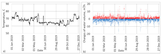 The results of calculations of water volume changes resulting from temperature changes are shown in Figure 10b. The increase in water volume is marked with red points and the decrease in water volume is marked with blue points. In the analyzed DHS, whose volume is , the changes in water volume are from −5 m3/h to about +5 m3/h, sometimes greater.