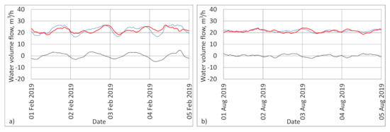 Figure 11 shows the results of calculations of changes in water volume in the analyzed DHS, during 1 h (black line) for typical days in the winter (Figure 11a) and summer (Figure 11b). The changes in the volume of water in the DHS during the winter are about 2–3 times higher than the changes during the summer, because, in summer, the water temperature is almost constant and does not depend on the outside air temperature value. On the other hand, in winter, the value of the feed water temperature for the DHS is variable and depends on the outside air temperature changes.