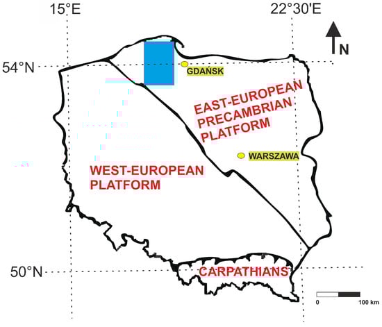 Location of the study area (blue rectangle) in relation to Poland’s general tectonic units (see in [9] (modified)).