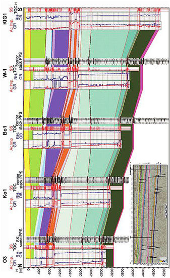 Lithostratigraphic well correlation section between wells O3, Ko1, Bo1, KIG1, and Well W-1, together with a structural interpretation of seismic data (see in [8] (modified)).