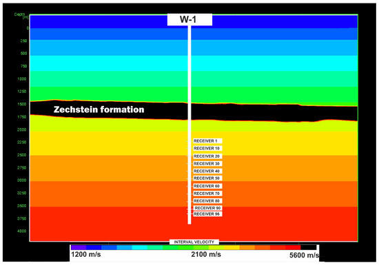 W2H was the 18th well drilled for shale gas exploration and the 3rd horizontal well drilled in Poland. The hydraulic fracturing and microseismic monitoring had also already been completed in wells W2H and W3H. A 3D seismic survey was carried out in 2013 on an acreage of 76 km2. The profile of the walkaway VSP shot points was parallel to the horizontal direction of wells W2H and W3H. Figure 4 shows the locations of the VSP walkaway profile and the wells. Acquisition was finished by the end of 2016. In the vertical well, W-1, ninety-six BSR 3C receivers removable tool were used (Oyo Geospace Company) with GeoRes Downhole System Digital Module 3-CH X 24-BIT DIGITIZER (Geospace Technologies). The distance between receivers was 15 m. The cable between receiver sections was BSR type (a total of 97 cables were used). The carrying and transmission cable was a well-logging fiber-optic cable type 6E4FO592 with a maximum of 4200 m. In this study, we present the results from the depth interval between the first receiver at a depth of 2400 m and the ninety-sixth receiver at a depth of 3825 m MDGL (measured depth from ground level). Acquisition was carried out after heavy rainfall between October and November. It was not possible to perform acquisition at a different time, so all challenges had to be overcome at the processing stage. The very soggy ground caused a significant difference in shot point elevation between sweeps. Moreover, the characteristics of the near-surface zone at this point also changed due to compaction or a change in the filling fluids in the pore space. Heavy seismic vibrator trucks almost sank into the soaked ground. The receivers were placed mainly in Wenlock and Upper Silurian rocks. This made it possible to observe and investigate the behavior of seismic signals (anisotropy and P-wave polarization analysis) passing through the Zechstein formation, which is well known for its highly seismic signal-attenuating properties. The interval velocity model used for seismic depth migration and the trajectory of well W-1 is presented in Figure 5 (the Zechstein formation is colored black). The sweep length was 16 s with a frequency range of 6–120 Hz; recording time was 4 s. The distance between the 480 shot points was 25 m; total length across the profile was 12 km. Due to the extremely bad acquisition conditions and the low signal-to-noise ratios, up to 8 sweeps were generated on each shot point.