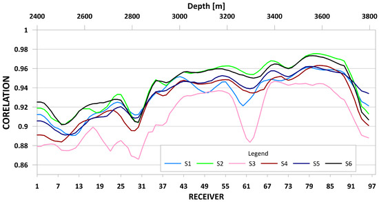 At the beginning of the examined depth interval, we can see the lowest correlation for all sweeps. This is an expected effect, as there was no casing between the and the tubes in this part. In the rest of the well, where casing is present, we can see significantly higher correlation, except for the 3200–3400 depth interval, where the correlations are weaker. This is probably due to weak anchorage of receivers in this part of the well; however, this is also a change zone between the Ludlow and upper Silurian complexes.