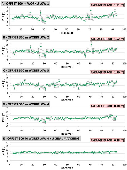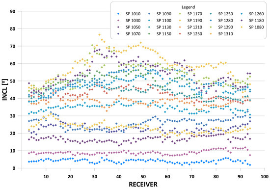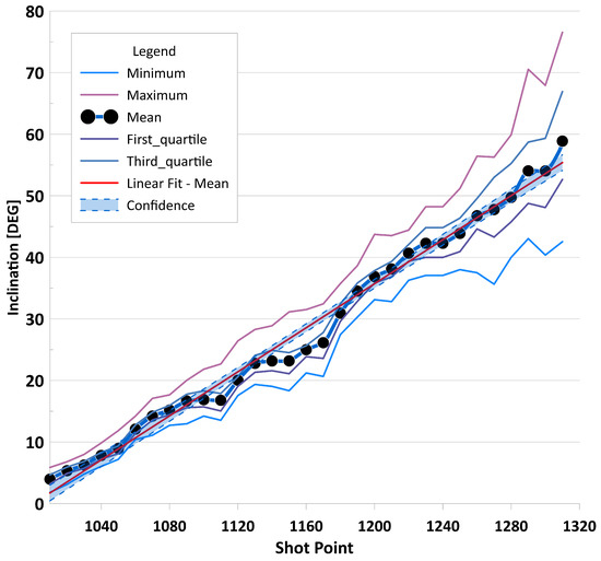 where is inclination value for a particular receiver, is the error for a receiver at depth point n, N is a group of 5 receivers, and is the average value of the inclination angle for this group. Then, the simple arithmetic averages of the standard deviations calculated in the previous step were considered as average errors for each shot point using Equation (2):
