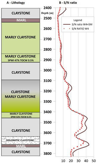 Lithostratigraphic column in Well W-1 with S/N ratio graph for W4 (red triangles), and W4 with signal-matching procedure added (brown solid line).