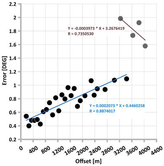 Average polarization angle determination error (y axis) against the offset (x axis) for W4 with signal-matching procedure added (black dot) with linear trend line (blue).