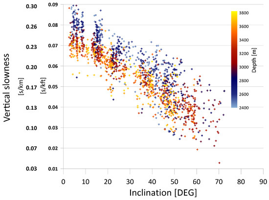 Vertical slowness polarization graph for all offsets and depth points used for calculations.
