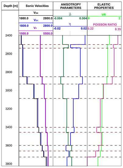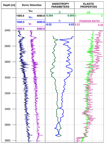 Figure 17 shows sonic , , velocities; and from VSP inversion; and with Poisson ratio. Figure 18 shows the same parameter set averaged to the single value in the layers. In the first marl layer, rapid changes in and are clearly visible, whereas the other parameters remain stable. A similar situation is observed in the thin marl layer located at a depth below 3700 m. Again, there is almost no change in and velocity. A similar situation can be noticed in saturated marly claystone. The relative change in VSP anisotropic parameters is more visible than in . The change in the sonic velocities is noticeable, but their ratio remains almost unchanged. An interesting phenomenon can be observed when claystone transitions into dolomitic claystone, where the signs pf the parameters and change. In Jakobsen and Johansen’s [17] laboratory studies on the anisotropy of mudrocks, positive was present in the rocks with low porosity, while negative values were related to higher porosity value.