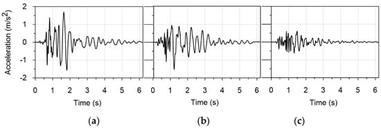 Acceleration-time histories of the shock recorded in the Upper Silesian Basin (USB) region: (a) horizontal direction W–E; (b) horizontal direction N–S; (c) vertical direction Z.