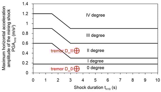 The intensities of both vibrations presented against the background of the GSI-GZWKW-2012 A scale are shown in Figure 3. It must be pointed out that about 95% of tremors, which occur in the USB region, are classified as 0, I, or II degree of vibration intensity [39]. Since the scale GSI-GZWKW-2012-A does not refer to bridges or roads, the present study serves only to assess the intensity and strength of the analyzed mining-induced shocks. Neither structural nor nonstructural damages of the bridge were investigated based on the scale.