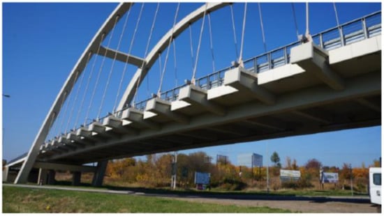 The bridge analyzed in this case study (Figure 4), located in Southern Poland, was erected in 2013. The primary structural system of this five-span bridge consists of two continuous prestressed girders integrated with a concrete slab and linked by crossbars. The deck is suspended with 28 hangers on two arches over the length of the longest central span. The bridge geometry (span lengths and cross-section dimensions) is depicted in Figure 5. Each girder beam is prestressed by steel tendons with a cross-sectional area of 150 cm2. The building classes of bridge materials are collated in Table 1.