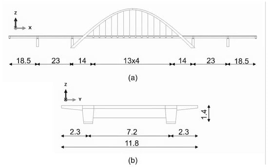Bridge geometry and dimensions (m): (a) side view, (b) deck cross-section.