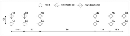 The superstructure rests on abutments and four pairs of intermediate pillars, supported by a system of pot bearings. A set of fixed and transversally guided sliding bearings is used over the supports along axis no. 4, whereas multidirectional and longitudinally guided sliding bearings are applied at other supports according to the scheme presented in Figure 6. Characteristic load-bearing capacities vary from 1500 kN (at axes 1 and 6 situated on the abutments) through 3250 kN (at axes 3 and 4) to 3600 kN (at axes 2 and 5). The pillars are 5.9 m high and have square cross-sections of 1.4 × 1.4 m.