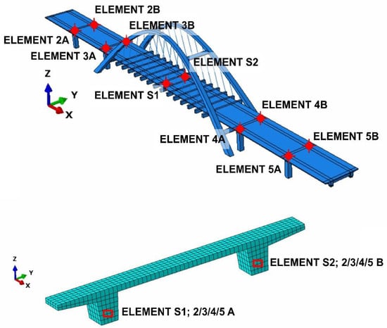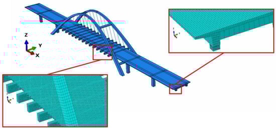 The numerical analysis of the bridge performance was conducted in Abaqus FEA software [40]. About 220,000 finite elements were incorporated into the model. Linear 8-node brick elements were used to discretize the girders, crossbars, arches, and pillars. The slab was meshed with 8-node continuum shell elements, whereas the hangers were modeled with truss elements (see Figure 7). Rigid structural parts like abutments or foundation footings were disregarded in the bridge model since their deformability has a negligible impact on the dynamic structure performance.