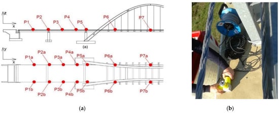 (a) Layout of measurement points for evaluation of modal properties of the bridge, (b) sensor assembly.