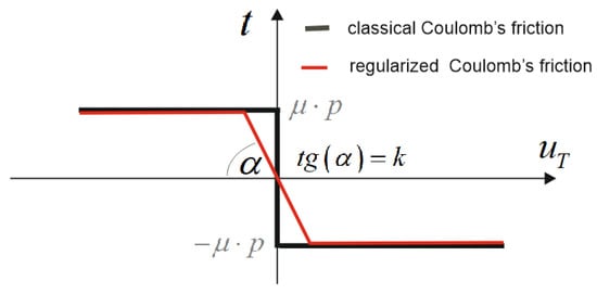 This formulation can also be seen as the regularization of the stick-slip behavior, allowing to avoid the numerical difficulties due to the non-differentiability of the classical Coulomb’s law at the onset of sliding [62] (see Figure 9).