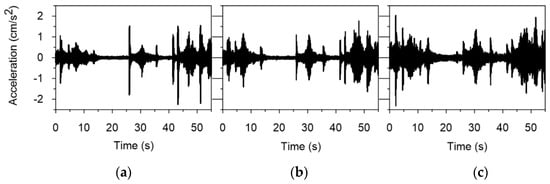 The acceleration-time histories registered at point P7a in (a) longitudinal direction, (b) transverse direction, (c) vertical direction.