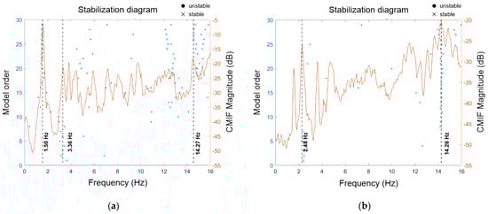 It can be observed from Figure 11a that the peaks and the stable poles of the CMIF diagram in the vertical direction are located at frequencies 1.50, 3.36, and 14.26 Hz. Additional stable poles, appearing around 12 Hz, are not confirmed as the maximum values of the CMIF magnitude or in the numerical prediction. For the horizontal direction, the maximum values and the stable poles are observed in Figure 11b at the frequencies 2.48 and 14.26 Hz.