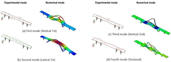 Comparison of the modes of vibration obtained from the in situ tests and from the numerical calculations: (a) first mode (1st vertical); (b) second mode (1st lateral); (c) third mode (2nd vertical); (d) fourth mode (1st torsional).