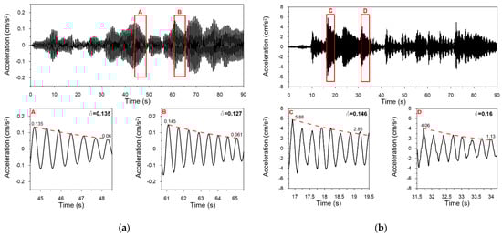 Exemplary free decay plots for the frequency related to the first and second vertical vibration modes are shown in Figure 13a,b, respectively. Such plots, obtained for all measurement points, were the basis of the evaluation of the logarithmic damping decrements and damping rations.