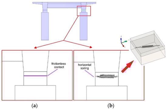 The pot bearings were modeled by various connector element types provided by the Abaqus software: JOIN—for the fixed bearings, PLANAR for the multidirectional bearings, and AXIAL—for the unidirectional bearings. The PLANAR and AXIAL connectors allow for free translation in the direction of the predefined plane and axis, respectively.