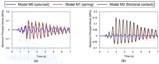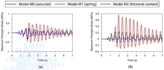 Comparison of stress-time histories of maximal principal stresses obtained for three models of the bridge subjected to the tremor of medium-intensity (D_II) at elements: (a) S1 (in the middle of the longest span); (b) 3B (above the transversely sliding bearing).