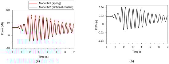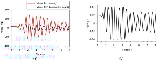 The forces generated in the bearing (connector) 3B for models M1 and M2, as well as the friction-to-normal contact force ratio for the D_II tremor, are presented in Figure 21a,b, respectively. During each cycle of the intensive phase of the tremor, horizontal excitation in the M2 model is strong enough to induce sliding in the bearing (see Figure 21b), which results in the limitation of the frictional force in the connector to 0.04 of the normal contact force, while the force in the M1 model spring, which is not limited, is considerably greater (see Figure 21a).