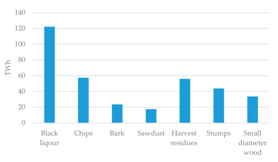 Nordic forest biomass potential split on different biomass types except roundwood (TWh/year). Sources: Pöyry and Nordic Energy Research [33].