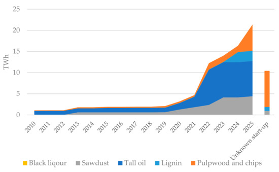 Identified planned liquid forest-based biofuel production capacity (accumulated) in Norway, Sweden and Finland for the period 2010–2025, and additional production capacity in projects with unknown start-up dates that may be regarded as uncertain. Source: [34].