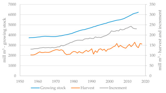 Nordic (Norway, Sweden and Finland) growing stock (left axis), yearly harvest (right axis) and increment (right axis). Source: [42,43,44,45,46,47,48].