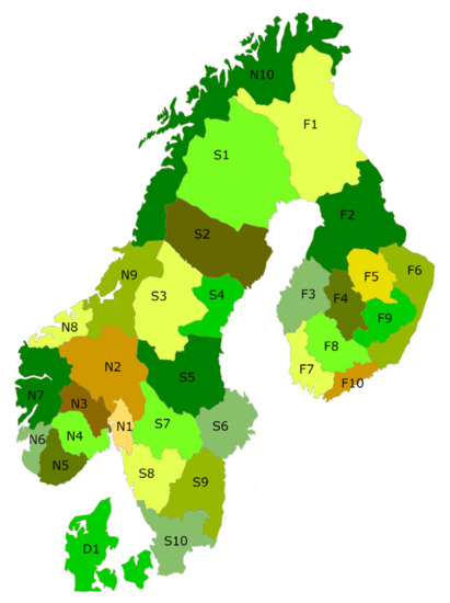 The markets for inputs and outputs for the Nordic forest sector are highly interconnected [49,50,51]. In order to describe the cross-border roundwood balance between the Nordic countries, Mustapha [52] developed the Nordic forest sector model (NFSM). The NFSM is built on the Nordic Trade Model that was launched in 1995 by Trømborg and Solberg [53], and further developed by Bolkesjø, et al. [54], Bolkesjø, et al. [55], Trømborg and Sjølie [56], and Trømborg, Bolkesjø and Solberg [26]. The model covers 32 regions: 10 each in Norway, Sweden and Finland, one region in Denmark and one in the rest of the world (ROW) (Figure 4).
