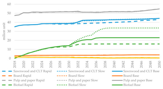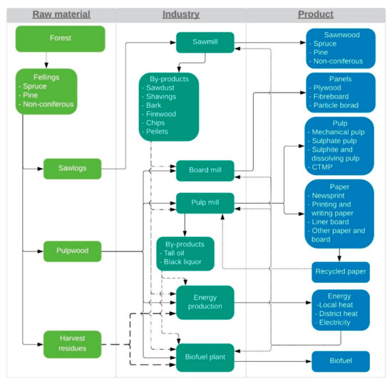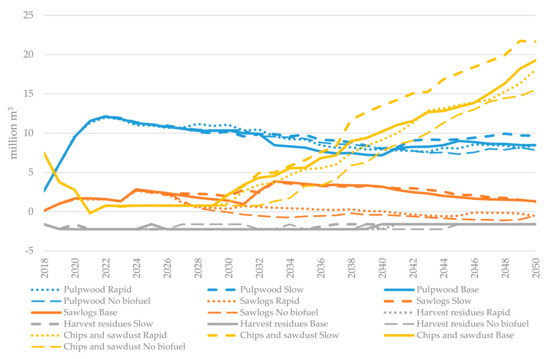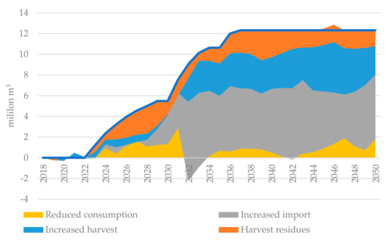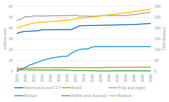 As shown in Figure 3, forest resources are steadily increasing due to a modest harvesting level compared to the increment. There is thus an opportunity to increase harvest levels, and Rytter, et al. [41] found that forest growth can be further increased by 50–100% via change of tree species (including the use of non-native species), tree breeding, introduction of high-productive systems with the opportunity to use nurse crops, fertilization, and afforestation. It must be noted that the future amount of available roundwood is uncertain; for instance, drought, bark beetle and fire can substantially reduce the stock available for harvest.