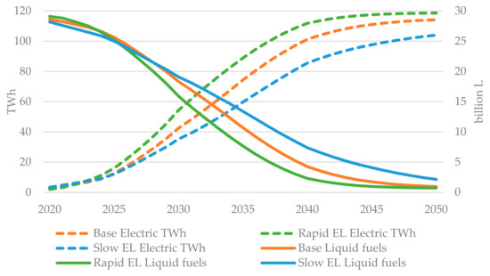 We estimate future demand (i.e., consumption) for forest-based biofuel in the Nordic countries based on the estimated demand for liquid fuels, blending requirements of biofuel and the share of forest-based biofuel. The total number of vehicles and the total driving distances are based on historical figures [69,70,71,72] and it is assumed that they remain constant throughout the period in question. It is assumed that the vehicle retirement age follows historical figures [73], and each retired vehicle is replaced with either an electric or a fossil fuel-powered vehicle with an estimated probability function for year of wracking [74,75,76]. In Norway, the stated policy is that all new private vehicles must be zero emission from 2025, and the country aims to fully electrify all other new vehicles by 2035 [74]. Sweden does not have such clear goals, but Svenskt Näringsliv [75] estimates that almost all new private vehicles from 2025 will be plug-in hybrids or electric, and the country will be close to the full electrification of all new vehicles in 2030.