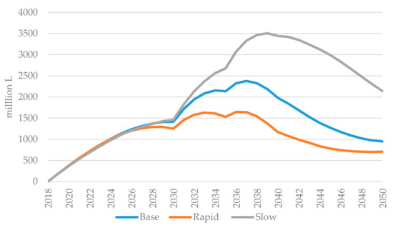 The increasing share of electricity implies that the potential use of forest-based biofuels in the domestic Nordic market will reach a peak in 2037 of 2400 mill L in the base scenario and 1650 mill L in 2036 in the rapid electrification (EL) scenario (Figure 7). These volumes are based on the slow EL scenario, giving a peak for forest-based biofuels of 3500 mill L in 2039. These volumes correspond to a solid biomass use of about 13, 18 and 27 mill m3, respectively, when assuming a 60% efficiency from wood to fuel. The total roundwood harvest in the Nordic countries was about 150 mill m3 in 2020.