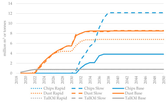 - Sweden and Finland each: 0.2 mill m3 p.a. between 2022–2030, 0.4 mill m3 p.a. between 2031–2040, and 0.6 mill m3 p.a. between 2041–2050.
