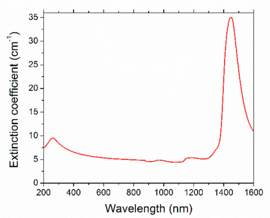 Spectral extinction coefficient of the sample with 0.13 g/L concentration. The experimental uncertainty on the extinction coefficient is 2%.