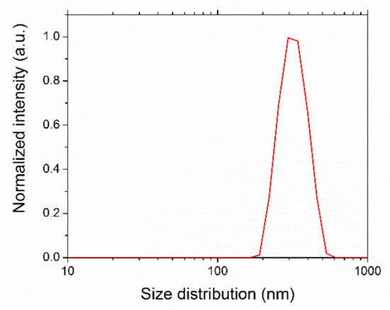 Diagnostic measurements were firstly carried out on the samples. Transmittance measurements did not evidence anomalous intensity and shape of the plasmonic peak of SWCNHs. From transmittance spectra, we obtained the spectral extinction coefficient (Figure 1), referred to low input light intensity, as in the definition which is usual in the literature. Mean dimensions of aggregates, measured by DLS, were 336 ± 10 nm; see Figure 2 for the size distribution.