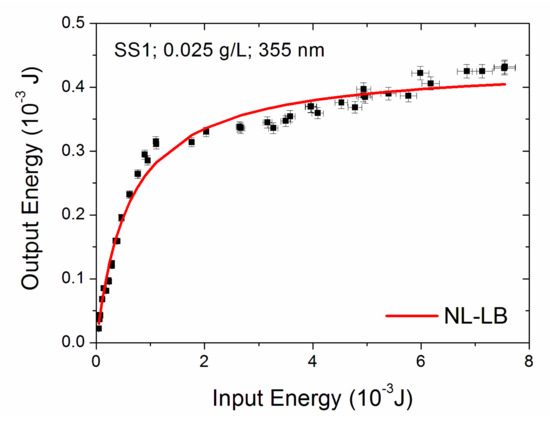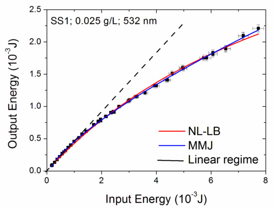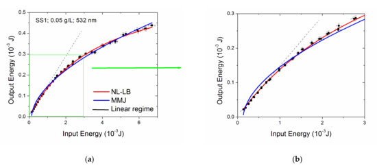 As reported (see Figure 4 showing the behavior of the sample with 0.0025 g/L concentration, probed by the at 532 nm wavelength), when optical limiting is not strong, both models equally fit the experimental data. The obtained energy threshold values are (1.1 ± 0.1) ×10−3 J for NL-LB and (4.0 ± 0.2) ×10−4 J for MMJ. On the contrary, in case of a stronger optical limiting, typically the NL-LB model reproduces the first experimental points deviating from linearity, and the MMJ approach reconstructs the data points at higher energies, as reported in Figure 5, showing the sample at 0.005 g/L concentration, for the same 532 nm incident wavelength. Figure 5b enlarges the view on the first experimental points. Thus, from Figure 5b, it is possible to see that the NL-LB model reproduces the experimental trend at lower input energy values more precisely, while the MMJ model would be more appropriate at higher input ranges (see Figure 5a). For this particular case, the MMJ model turns out to be not statistically acceptable due to the poor data reconstruction at low input energies.