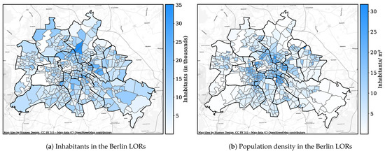 We derive the number of inhabitants for each LOR from [23], which is a freely available statistic provided by the Berlin authorities. The statistic is created by counting all registered residents within the LORs in 2018. The LOR classification, the population density, and the number of inhabitants within the LORs are depicted in Figure 1.