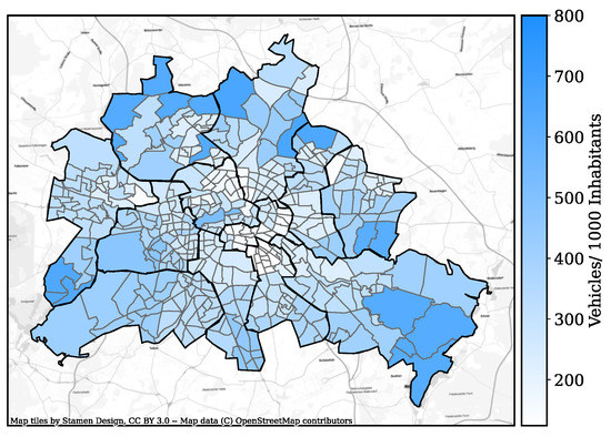 To estimate the number of vehicles in each LOR, we use freely available data about the degree of motorisation (amount of vehicles per 1000 inhabitants) in each LOR [24]. The degree of motorisation for the Berlin LORs is depicted in Figure 2. It can be seen that the degree of motorisation is higher in LORs that are located in the peripheral areas of the city compared to the city center. By multiplying the amount of vehicles per person with the total amount of persons within the LORs, we calculate the number of vehicles for each LOR separately.