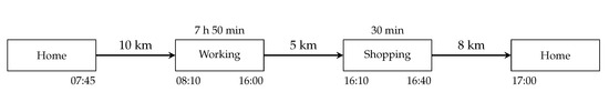 As a basis for the mobility profiles of the vehicles, we analysed the data set from the 2017 German household travel survey (GHTS) [20,21,22]. A mobility profile is a sequence of activities and trips between those activities. For our study, we assumed that BEV drivers show the same mobility behaviour as ICEV users. In Figure 4, a general mobility profile of a vehicle is shown. The vehicle starts at “Home” in the morning before spending 7 h and 50 min at the activity “Working” and 30 min at the activity “Shopping”. It arrives back “Home” at 17:00. In order to create mobility profiles, we extracted the relevant information on trips (activity, departure and arrival times, and trip distance) from the GHTS data. The data set distinguishes more than 25 activities. Similar to [10,19], we divide those activities into five superordinate activities for simplification reasons: “Working”, “Shopping”, “Education”, “Home”, and “Else”.