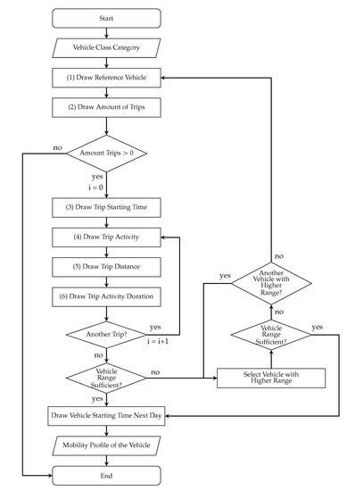 If the vehicle undertakes further trips, the loop is repeated with (4). The starting time of the next trip is the ending time of the last trip. If the last trip is for the activity “Home”, the loop is repeated with (3) and a new starting time is drawn.