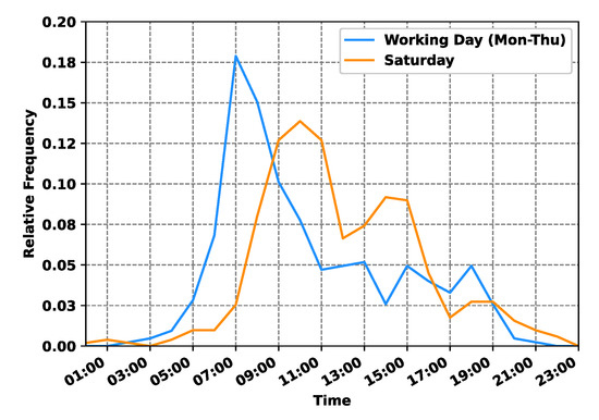 In (2), the number of trips per day for the vehicle is drawn. We derive the underlying discrete probability distribution by analysing the GHTS data set. A separate probability function is evaluated for each vehicle class category. If the number of trips is zero, no mobility profile is created for the vehicle and the process starts with the next vehicle. If the number of trips is greater than zero, the starting time of the first trip is drawn from a probability distribution we generated for a 24 h interval by analysing the GHTS data set (3). The probability distributions we use in (3) are depicted in Figure 6 for a working day (Monday–Thursday) and a Saturday. On a working day, one sharp peak can be seen at around 08:00 in the morning. This is due to the fact that many vehicles are used early in the morning on the way to work. In comparison, two less sharp peaks can be seen on Saturdays. Vehicles tend to be used on weekends for shopping or leisure activities, which start either in the late morning or afternoon.