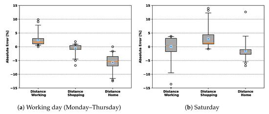 In Figure 7, a comparison of the cumulative distribution function of the trip distance of the simulation (blue) and the GHTS data set (orange) is shown. Figure 7a–c show the results for a working day (Monday–Thursday), Figure 7d–f show the results for Saturday. The figures are depicted for the activities “Working”, “Shopping”, and “Home”. The steps in the GHTS data graphs result from the self-reported travel times in the survey. Participants tend to report rounded numbers rather than give exact values. As it can be seen, the general distribution shape matches for all activities and days. In Figure 8, the modelling errors of the results in Figure 7 are depicted as a boxplot. The blue square indicates the mean error. The boxplot’s whiskers are modeled in such way that they represent the 2.5% quantile and the 97.5% quantile, respectively; 95% of all errors are thus within the whisker limits. The mean error is between −6.1% and 2.6% for a working day and between −2.0% and 3.3% on a Saturday. This indicates that the simulation represents the GHTS data with high accuracy.