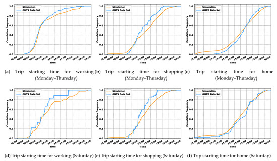 The first part of this section compares the simulation results with the GHTS data set. The comparison results are shown and discussed for the vehicles’ trip distance distribution, the vehicles’ average daily distances, and the amount of moving vehicles in Section 3.1; for the vehicle class category distribution in Section 3.2; and for the vehicles’ trip starting time distribution in Section 3.3.