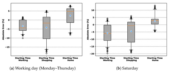In Figure 9, a comparison of the simulated cumulative distribution function of the trip’s starting time (blue) and the cumulative distribution function derived from the GHTS data set (orange) is shown. Figure 9a–c show the results for a working day (Monday–Thursday), Figure 9d–f show the results for Saturday. The figures are depicted for the activities “Working”, “Shopping”, and “Home”. While the general distribution shape for the activity “Home” matches well, errors exist for the activities “Working” and “Shopping”. Further improving the fit of those distributions would be a valuable future improvement. In Figure 10, the modelling errors of the results in Figure 9 are depicted as a boxplot. The mean error is between −4.3% and 2.6% for a working day (Monday–Thursday) and between −5.3% and 3.1% on a Saturday.