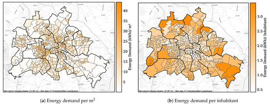 In Figure 12, the spatial distribution of the BEVs’ charging energy demand is depicted per m and per inhabitant for the Berlin LORs. It can be seen that the charging energy demand per m is higher in the inner city LORs compared to the peripheral areas. The higher population densities within the inner city LORs compensates the lower degree of motorisation and lower household income. The charging energy demand per inhabitant is higher in the peripheral areas of the city, as the degree of motorisation and the household income are higher in the peripheral LORs.